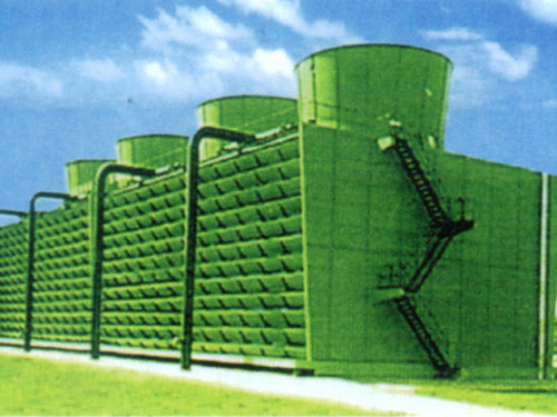 本塔采用两侧进风,靠顶部的风机,使空气经由塔两侧的填料,与热水进行质交换,湿热空气再排向塔外。填料采用两面有凸点,避免水滴直接滴下的机会,提高了形成水膜的作用,填料尾部设有收水措施。